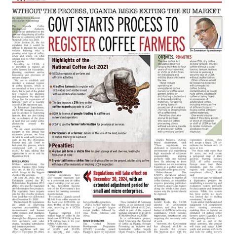 Second thing: the government coffee authority in Uganda is fast tracking registration of coffee farmers nationwide2. Why the hurry? The EU has a new anti-deforestation law that takes effect at the end of the year. If we haven’t got our ducks in a row, we shall be thrown out of this market.