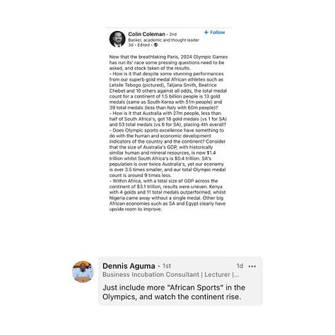 Two things this week. A conversation happening on LinkedIN1 about Africa’s performance at the just concluded Paris Olympics in comparison to lesser populated individual countries and regions.